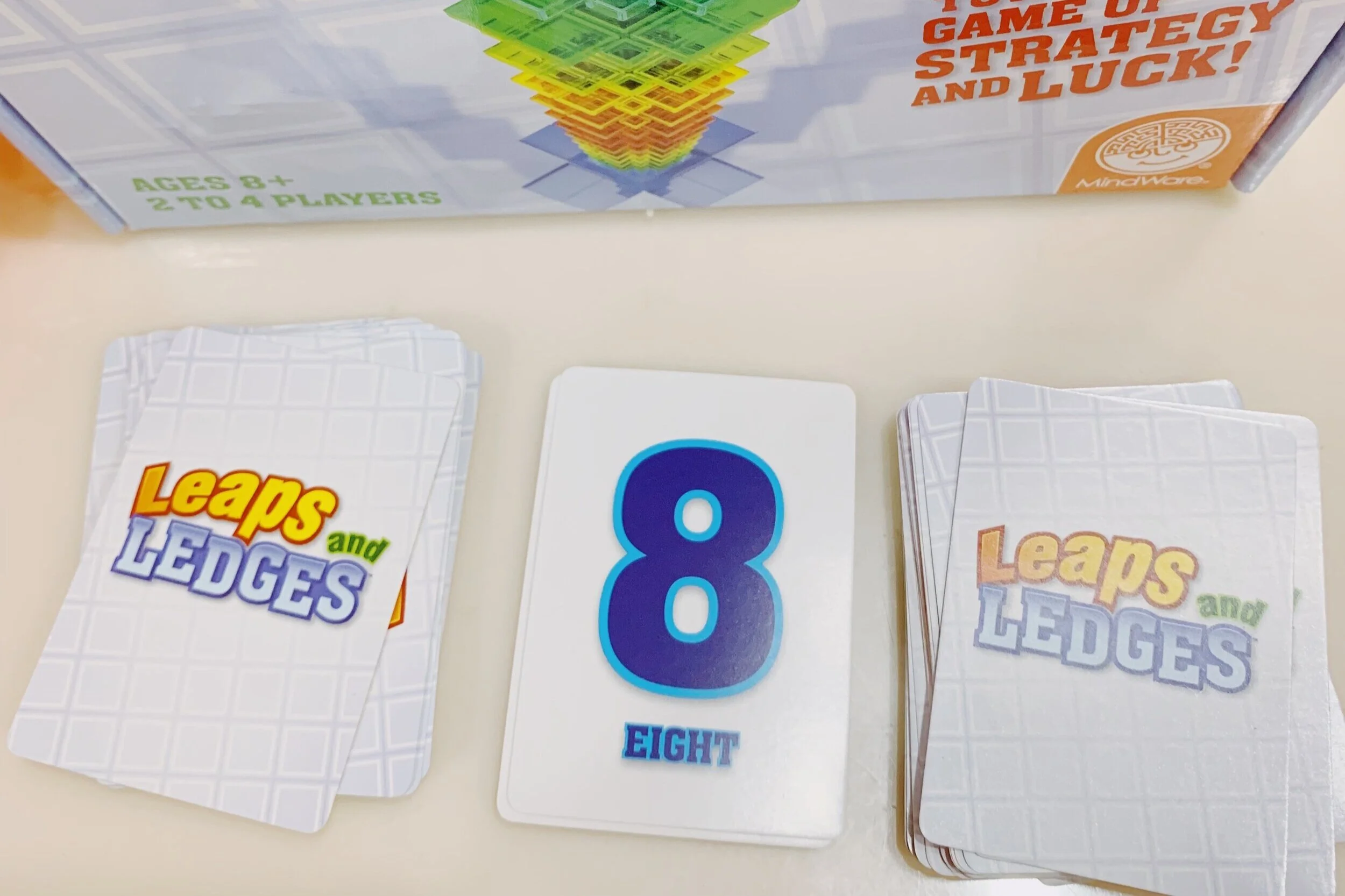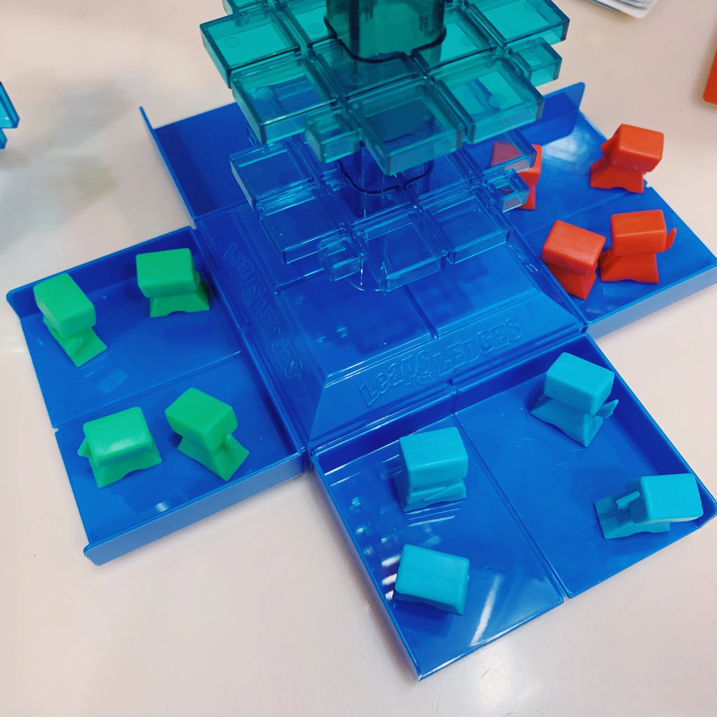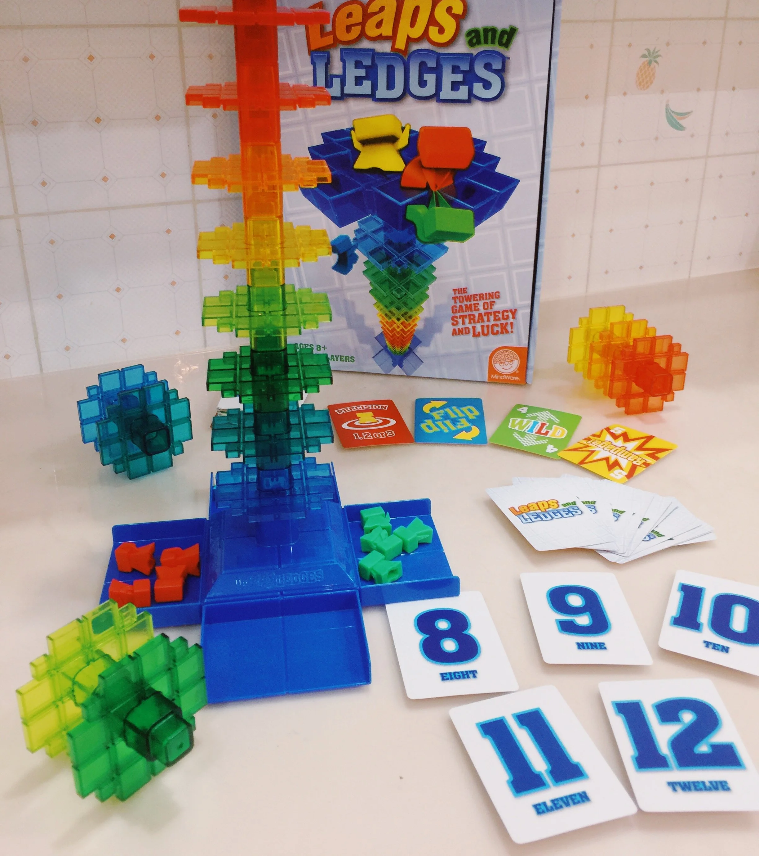 What you need to know: Leaps and Ledges is a unique card game for kids that incorporates some luck and a bit of strategy. The idea is to move all of your 4 pawns to the top of the tower before your opponent by following the directions on the cards. Beware of some of the special cards though cause they can either set you back or help you along (depending on the action you need to perform).